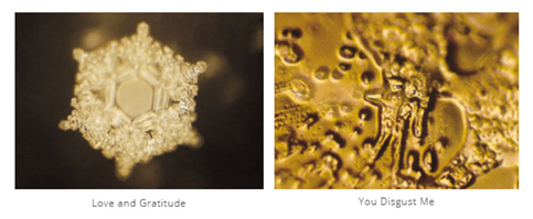 A Japanese scientist and water researcher, Dr.Masaru Emoto, studied the impact of thoughts and vibrations on the structure of water. He found that when words of love and gratitude were spoken near water, water crystals formed beautiful shapes. When evil or nasty words were spoken to a sample of water taken from the same sources, the crystals became distorted and ugly. Some remarkable results were produced. See the pictures below.