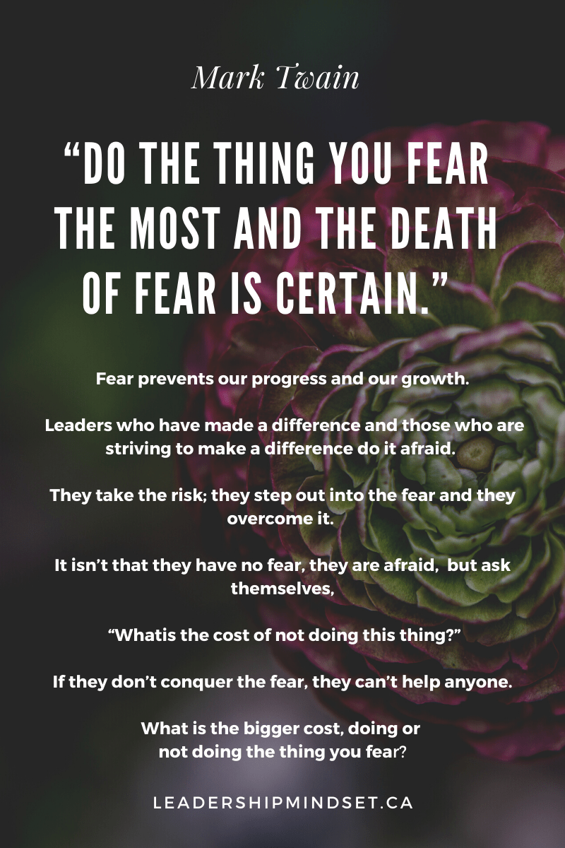 Leaders have courage. They face their fear by meeting it head on, by putting aside their emotions, and taking one step at a time to conquer fear. Otherwise it will derail them from their goals and vision. There are steps to overcome the fear and keep going. The more experience you get being courageous, the more fearless and courageous you become.